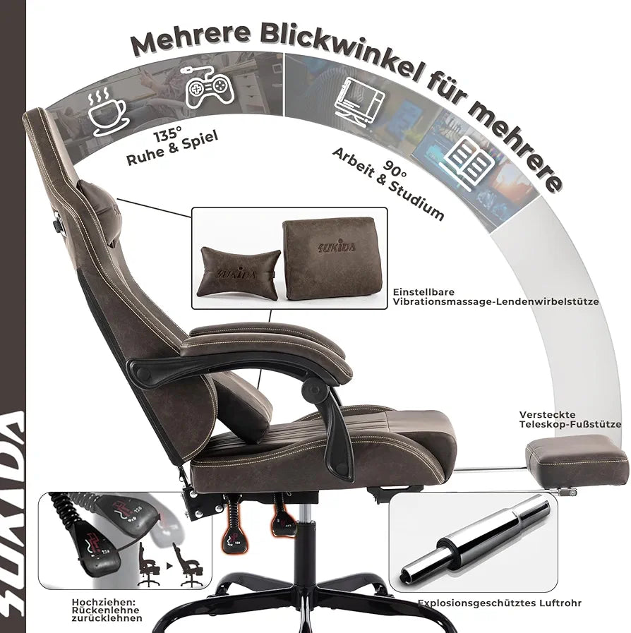 - Išskirtinis komfortas: ši žaidimų kėdė su patogia galvos atrama ir juosmens atrama ypač tinka žmonėms, kurie kenčia nuo kaklo skausmų dėl ilgų darbo ar žaidimų valandų. Galvos atrama mažina nuovargį, o minkšta pagalvėlė ir nuimama juosmens atrama papildo viena kitą, kad užtikrintų maksimalų sėdėjimo komfortą.