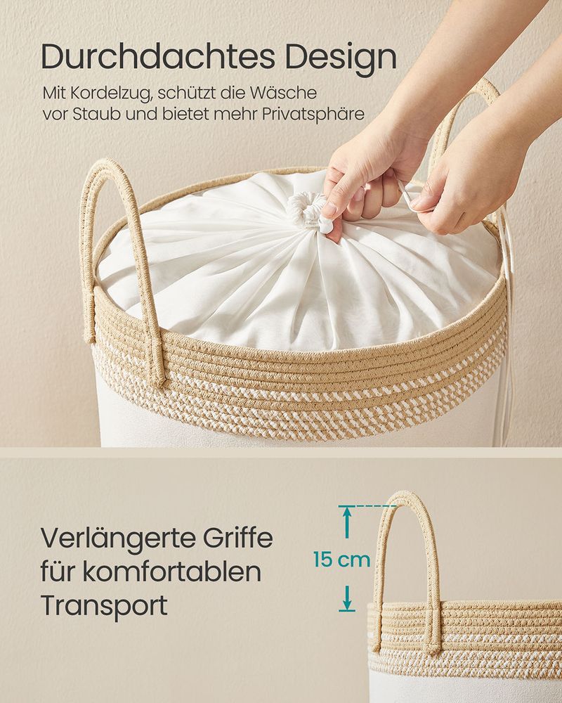 - Sutraukiamas raištelis viršuje apsaugo nuo dulkių ir neleidžia drabužiams iškristi. Pailgintos rankenos leidžia lengvai nešti skalbinių krepšį.