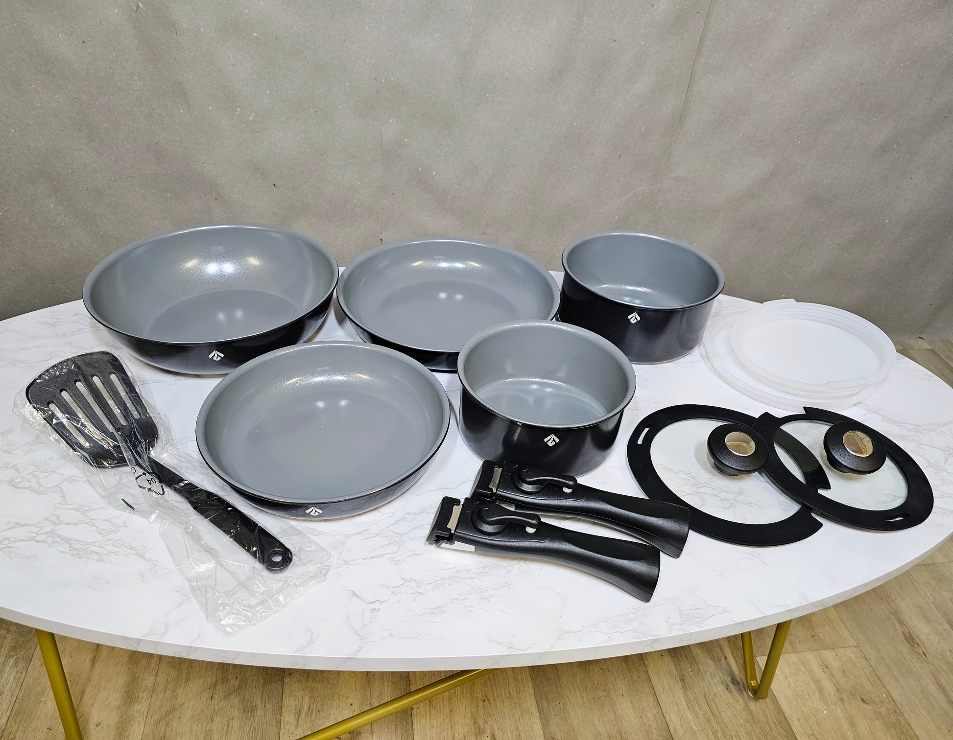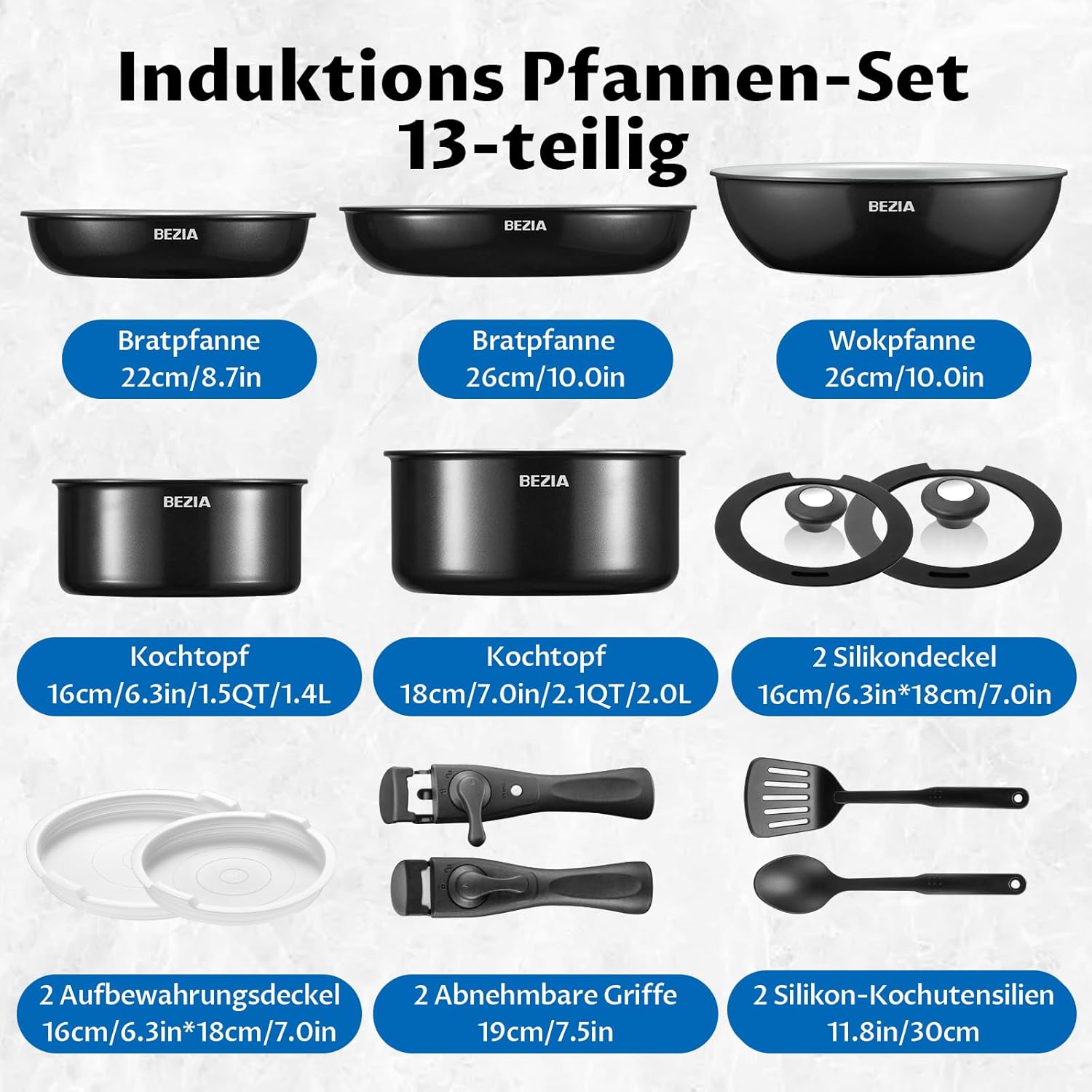2 keptuvės (didesnė ir mažesnė), gili troškinimo keptuvė, 2 puodai (didesnis ir mažesnis), 2 rankenos, 2 dangčiai, 2 laikymo šaldytuve dangteliai, mentelė